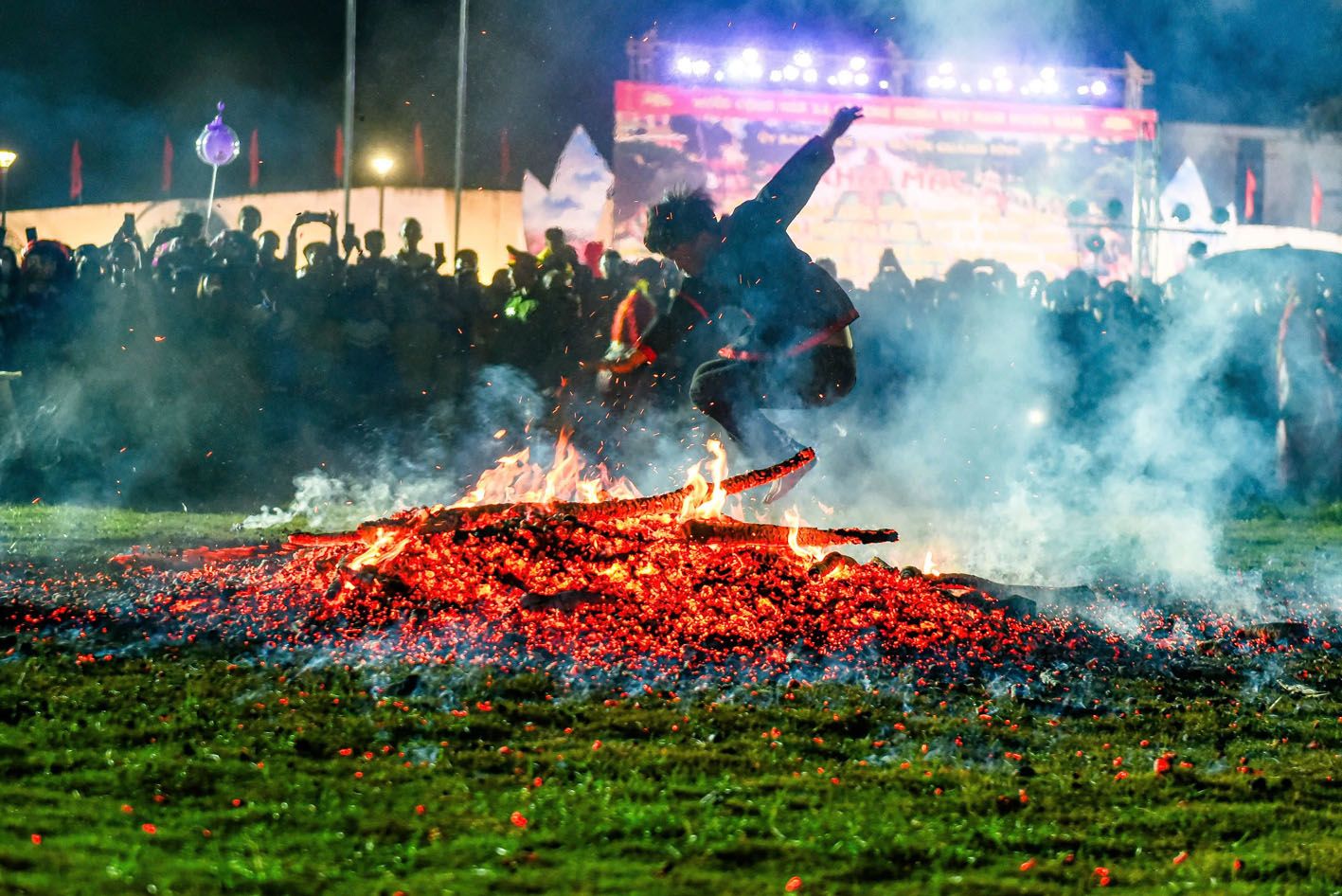 꽝빈현 떤박사 미박 마을의 전통 예술가 씬 반 투 씨가 파텐족 청년들이 신성한 불길 속으로 뛰어들기 전에 의식을 집전하고 있다.