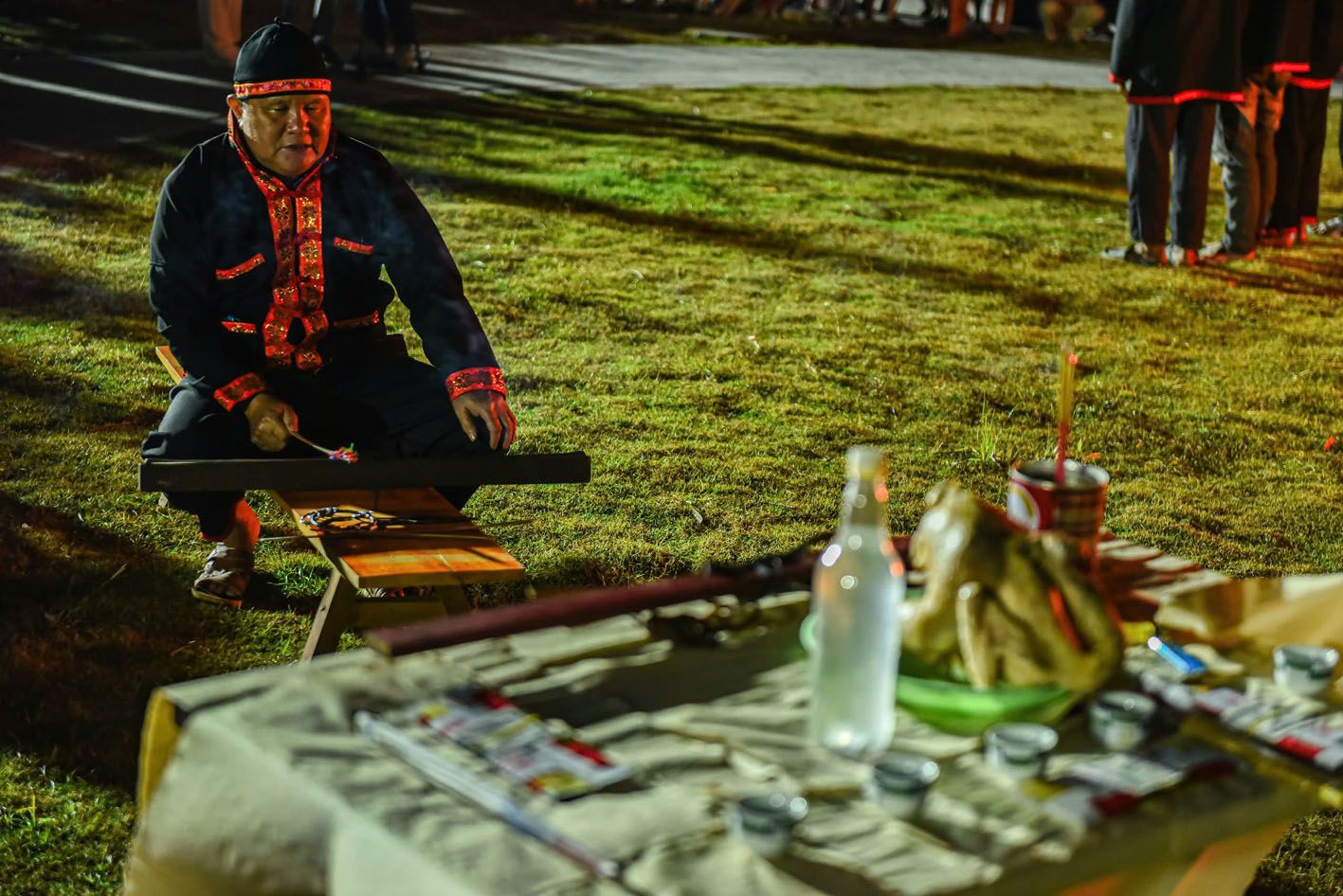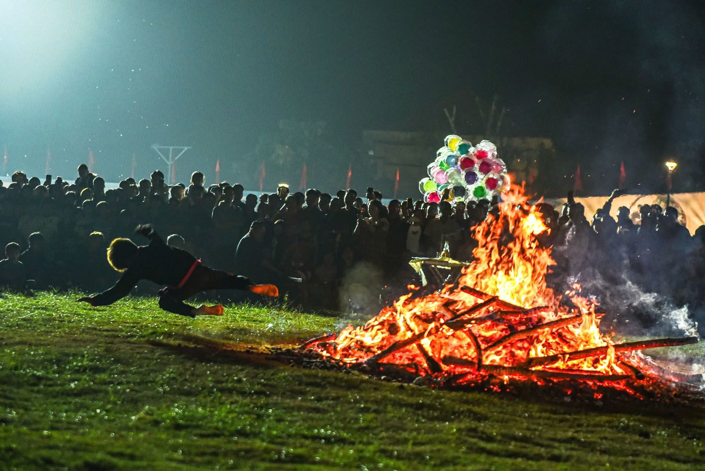 불춤 축제는 대체로 넓고 평평한 장소에서 열리며, 보통 마을 문화회관 앞마당이 행사 공간으로 활용된다. 청년들이 신성한 불길 속으로 뛰어들기 전, 무당은 마을 수호신인 토지신에게 제의를 올려 불춤 개최를 허락받는다. 이 제의는 약 40분간 이어지며, 이후 불의 신에게 올리는 제사가 30분간 진행된다. 신비로운 분위기 속에서 무당은 의자에 앉아 주문을 외우며, 손에는 대나무 막대로 ‘판쩌’라는 악기를 두드린다. 그 울림 하나하나는 인간과 신령을 잇는 매개로 여겨진다.
