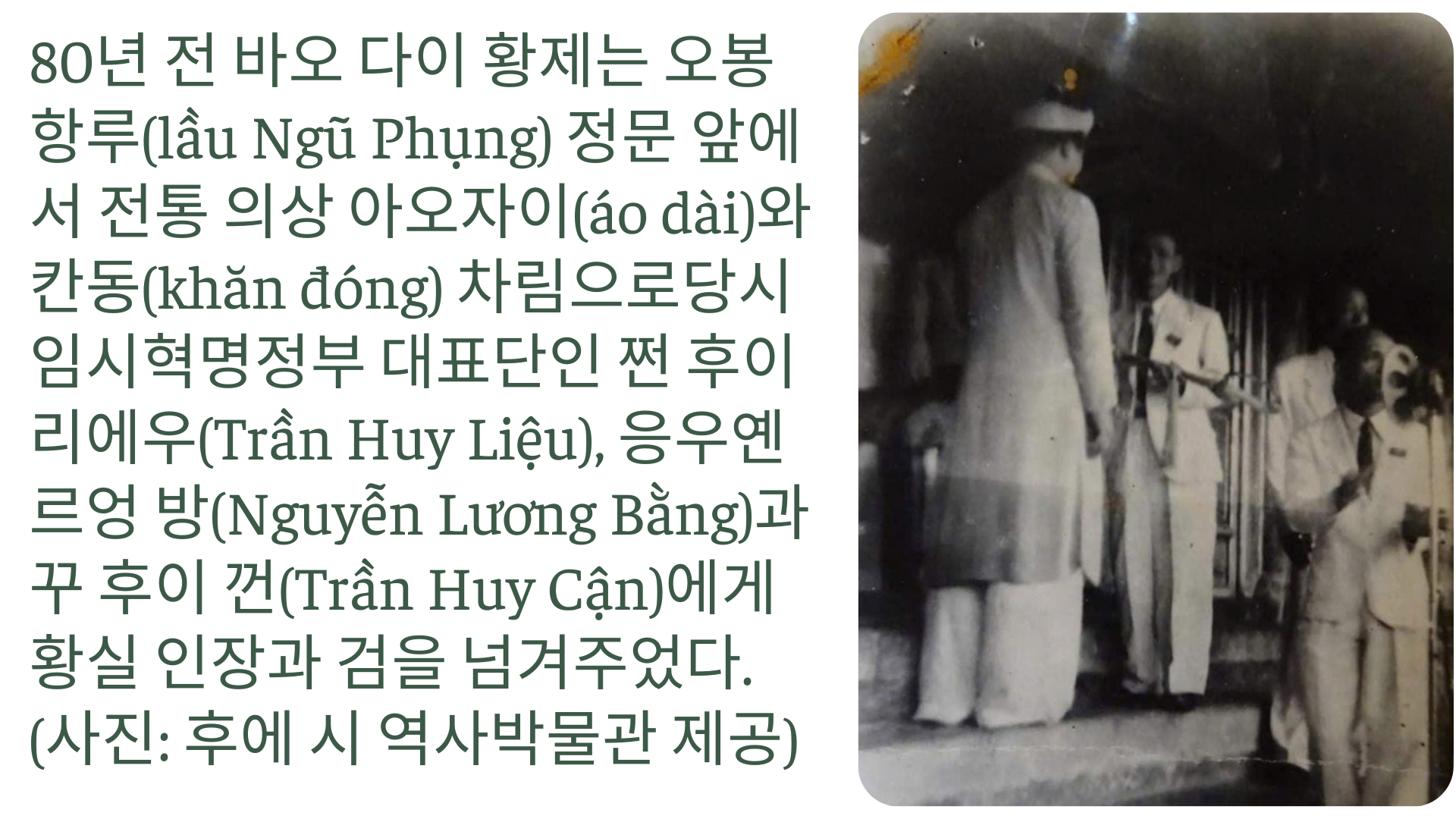 80년 전, 후에 왕궁에서는 8월 혁명 열기가 가득 했다. 붉은 바탕에 노란 별이 그려진 금성기가 성채 깃발탑에서 펄럭였다. 1945년 8월 30일에 응오문(Ngọ Môn)에서 바오 다이 황제는 임시혁명정부 대표들이 지켜보는 가운데 공식 퇴진했다. 수백년 동안 이어져 온 전제 군주가 막을 내리는 순간이었다