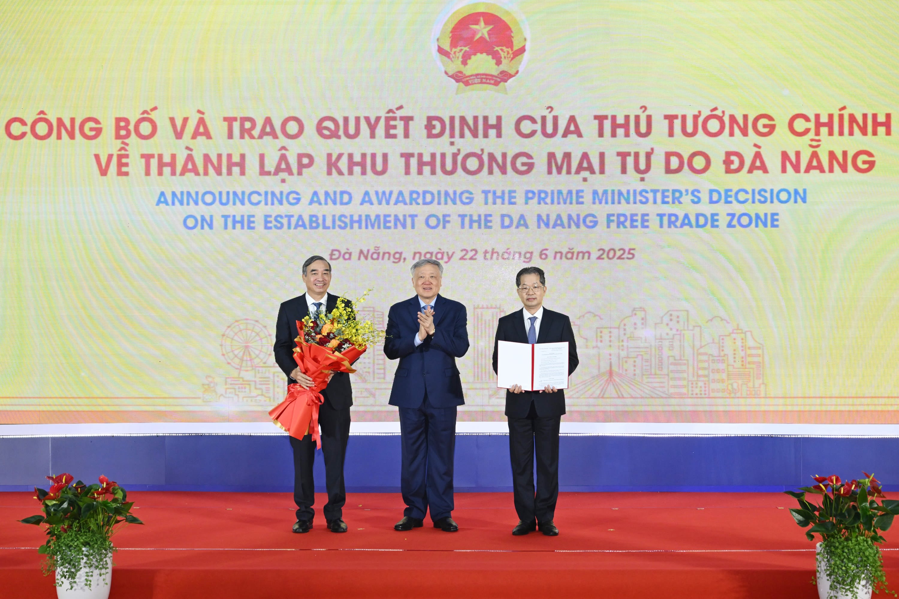 응우옌 호아 빙 정부 상임부총리가 다낭시에 자유무역지대(FTZ) 설립 결정서를 전달하며 축하하는 모습.