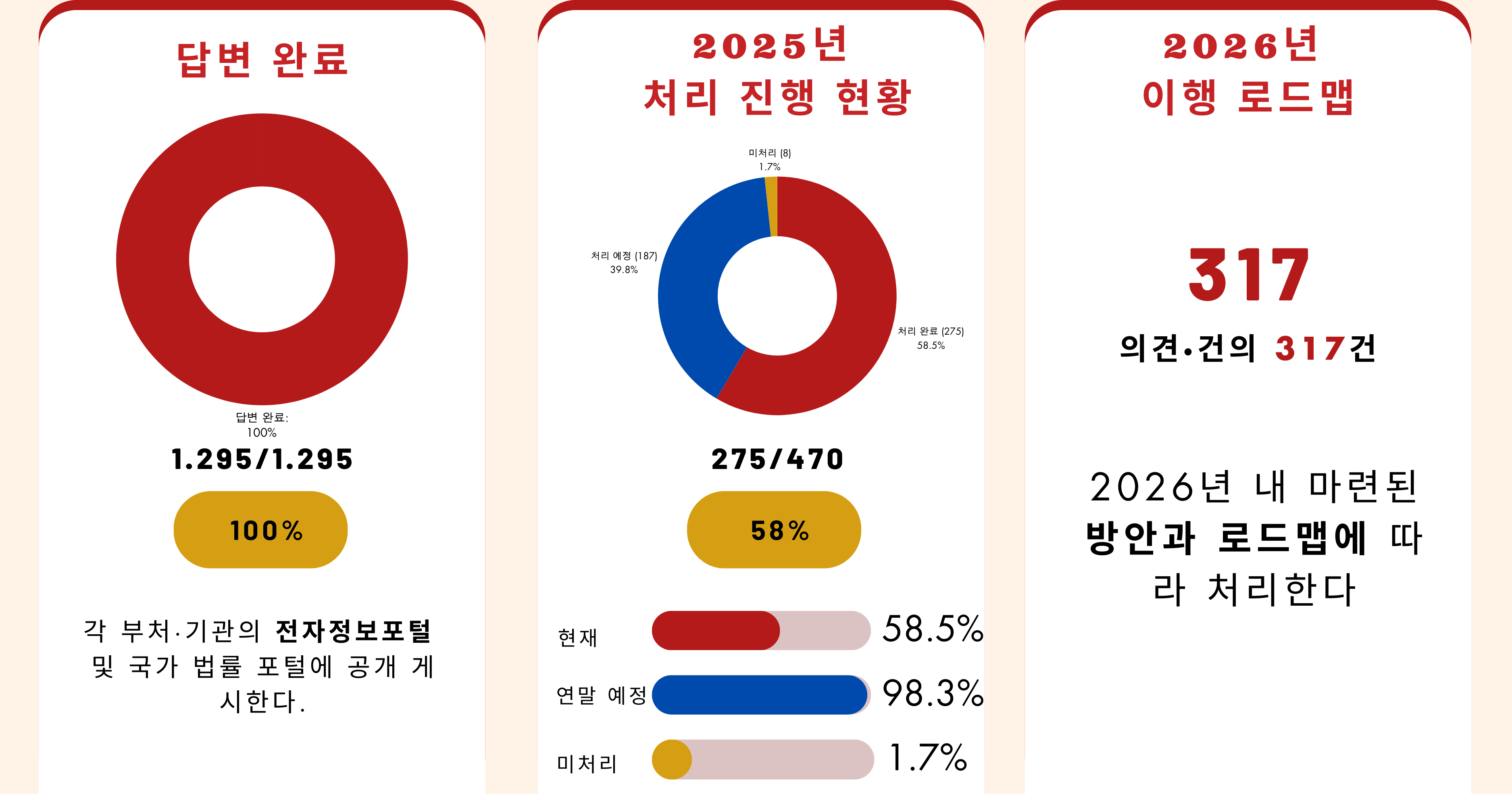 총 2,088건의 의견·건의 사항을 검토한 결과, 이 중 1,300건은 답변 및 공개가 필요한 어려움이나 애로 사항에 해당하지 않는 것으로 판단되었으며, 787건은 법률 규정으로 인한 어려움·애로 사항으로 확인되었다. 이 가운데 법률 규정으로 인한 787건의 의견·건의 사항 중 470건은 2025년 내 즉시 처리할 필요가 있는 사안으로 분류되었다.