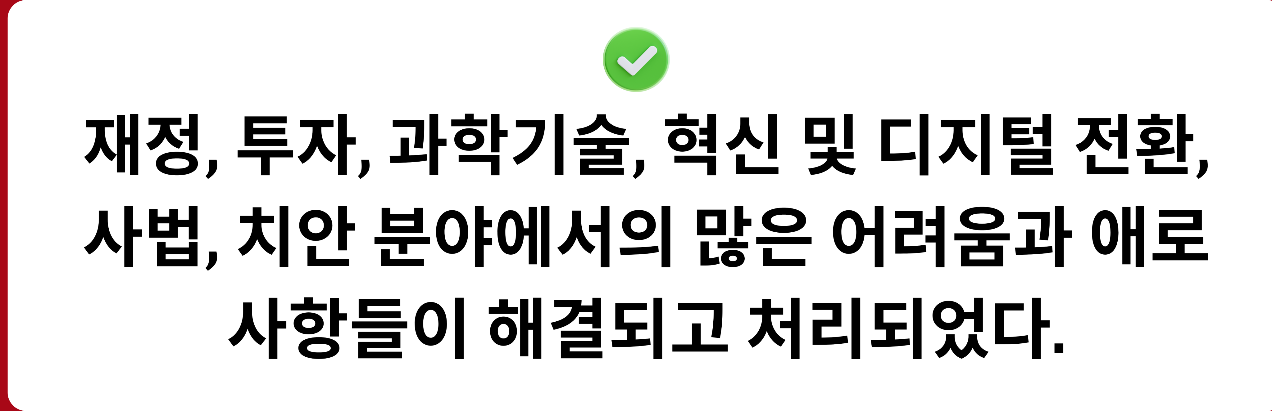 재정, 투자, 과학기술, 혁신 및 디지털 전환, 사법, 치안 분야에서의 많은 어려움과 애로사항들이 해결되고 처리되었다.