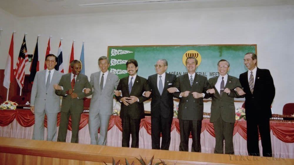 Minister of Foreign Affairs Nguyen Manh Cam (second from right), ASEAN Secretary-General, and Foreign Ministers of ASEAN member nations attend the meeting marking Viet Nam’s admission as ASEAN’s seventh official member on July 28, 1995, in Bandar Seri Begawan, Brunei. (Photo: VNA)