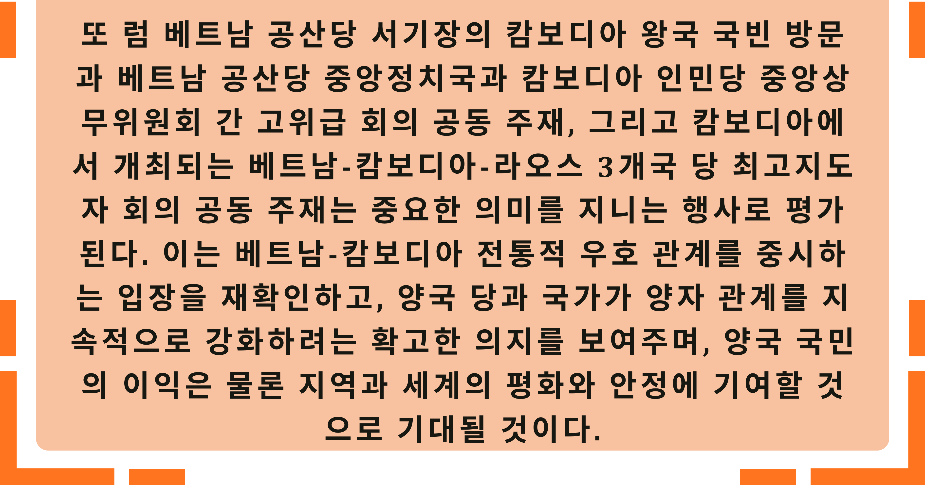 이번 방문은 제14차 전당대회 직후 이루어지는 베트남 공산당 서기장의 첫 캄보디아 방문으로, 양국 간 정치적 신뢰를 지속적으로 공고히 하고 모든 분야에서의 협력이 보다 실질적이고 효과적으로 진전되는 데 기여할 것으로 기대된다. 이번 방문은 베트남이 캄보디아와의 관계를 일관되게 중시하고 이를 더욱 심화하고자 하는 정책 기조를 재확인하는 계기가 될 뿐만 아니라, 양국 최고지도부 간의 신뢰와 유대를 강화하고, 나아가 베트남-캄보디아-라오스 3개국 간의 우호 협력 관계와 연대 정신을 더욱 촉진하는 의미를 지닌다.